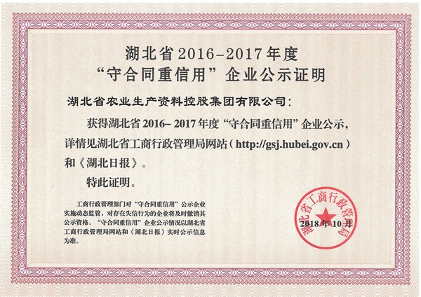 近日,湖北省工商行政管理局發(fā)布2016-2017年度“守合同重信用”企業(yè)名單,農(nóng)資控股集團(tuán)連續(xù)第七屆入選榜單。